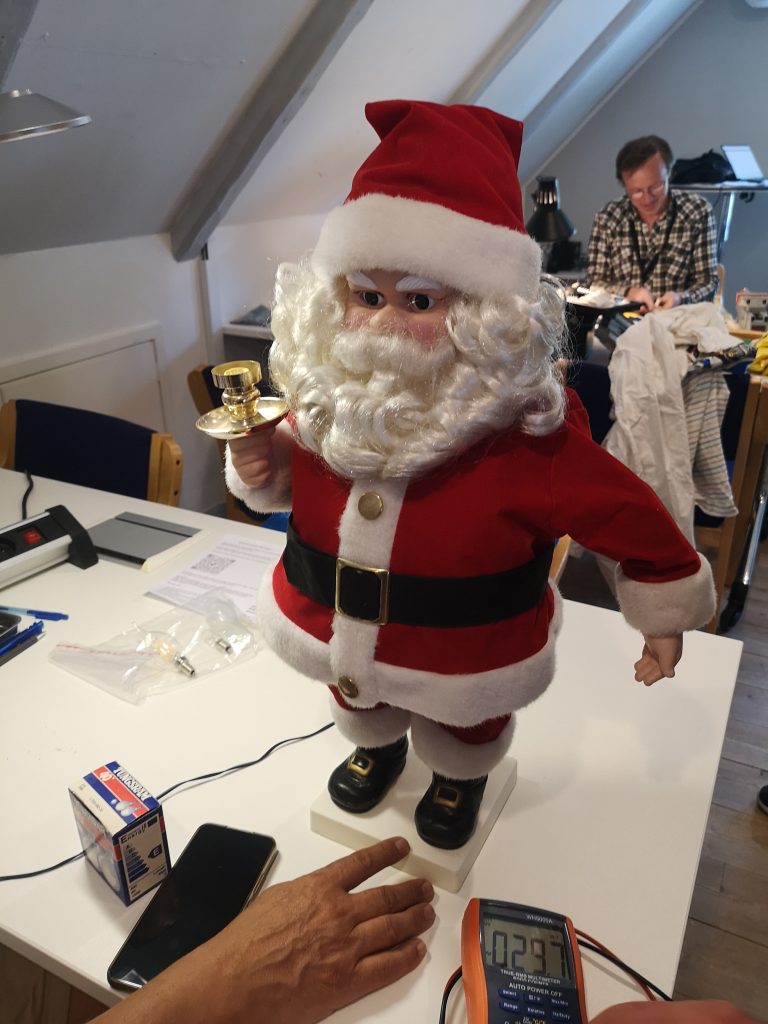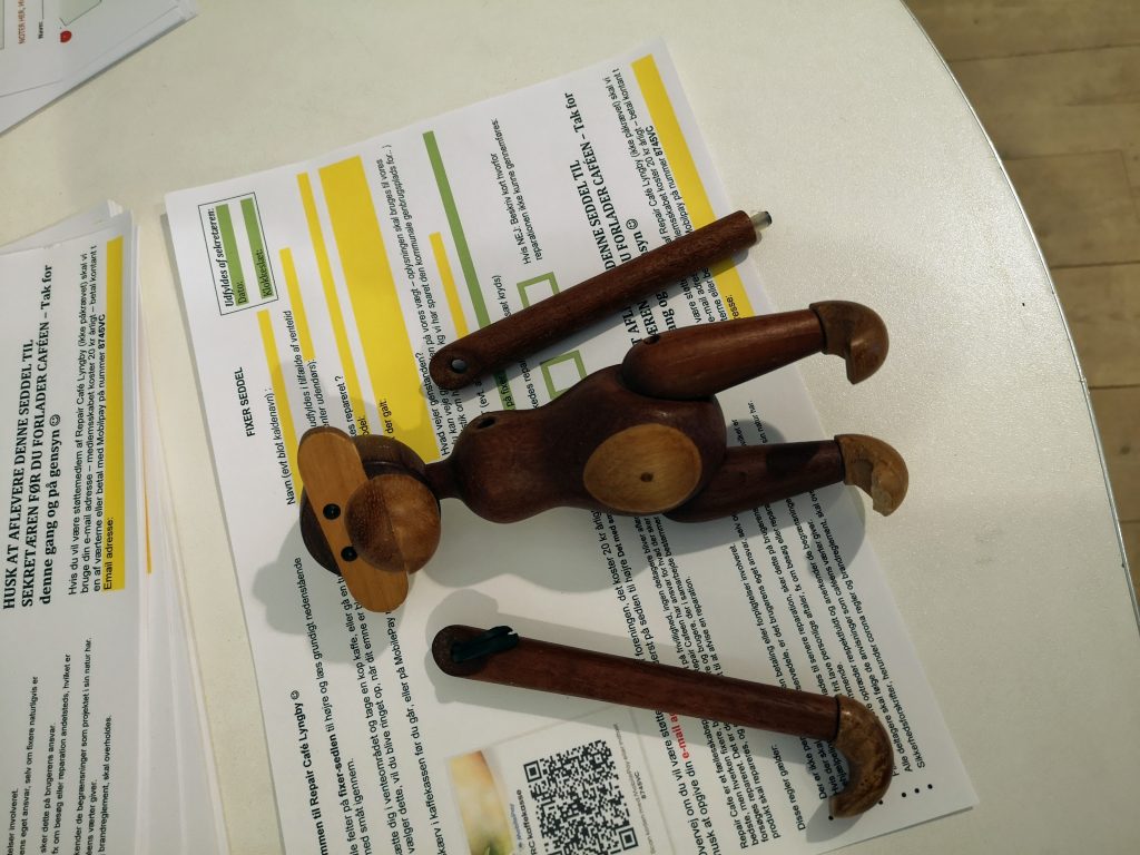På trods af udvidede corona restriktioner fik vi afholdt vores tredje Café i søndags, d. 15. november. Vi var utroligt spændte på, om der overhovedet ville dukke nogen op, med de restriktioner vi er pålagt. Vi havde mandet op med 10 fiksere/reparatører, hvilket er maks antal vi må være i vores “reparations rum” på første sal. Derudover var vi 3 i modtage rummet, således at der var plads til et par brugere, der kunne blive registreret og aflevere deres effekter. Vi må ikke være flere end 6 personer i dette rum. Ud over dette havde vi oprettet en form for ensretning, således at folk kunne fortsætte ud af bagudgangen, for på den måde at mindske kontakt med de personer, der eventuelt måtte stå ved indgangen og vente, til de kunne komme ind og blive registreret.Heldigvis kom der også denne gang mange besøgende. Vi fik indleveret 25 effekter, hvoraf de 16 blev repareret.Det første, der blev indleveret, var en mandshøj mekanisk nisse, der kunne synge og danse – men den var blevet træt, og dansede ikke mere. Hovedet, der kunne dreje, sad heller ikke fast længere. Det lykkedes at få hovedet på plads, men mekanikken til dansen kunne desværre ikke repareres, men nissen kunne stadig synge, da den forlod cafeen. Af andre specialiteter blev der indleveret en dobbelt strømforsyning, hvor den ene del fungerede, mens den anden del gav alt for høj spænding – denne tunge sag var dog for kompleks til, at nogen turde/kunne give sig i kast med at diagnosticere og reparere den.Der var en del elektroniske effekter, som vores nye fikser Simon meget nødig ville give op på. Cd afspiller, brummende aktive højttalere og fjernstyret racerbil. Disse effekter blev diagnosticeret, og repareret, hvor det var muligt.Igen var der en Kay Bojesen abe, der havde tabt armene, denne blev repareret – konklusionen må være: ingen Café uden en abe.