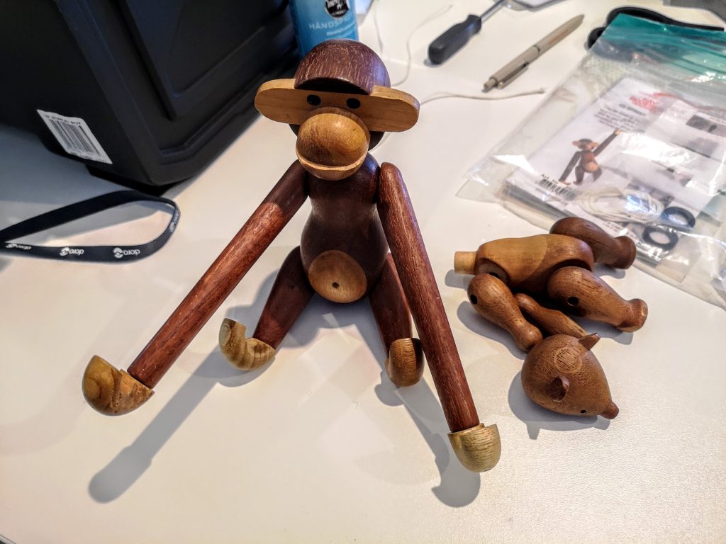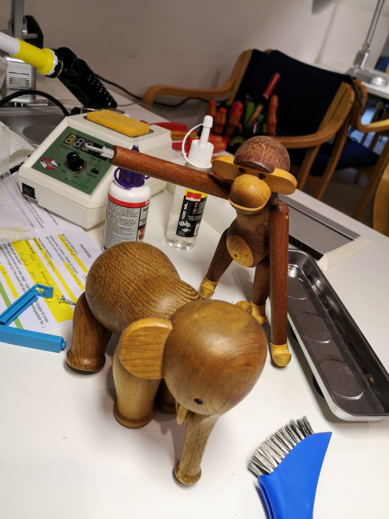 Der var for en gangs skyld ingen Kay Bojesen aber, men en bruger, der ville have repareret en blæser, havde en abe, hun ville komme med næste gang – Blæseren blev for resten heller ikke repareret denne gang, da vi enten skal have en reservedel fra brugeren, eller fundet nogle længere skruer.