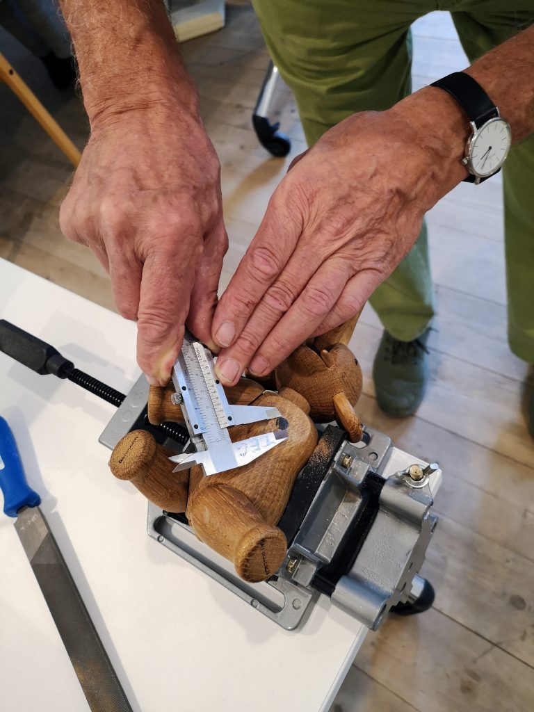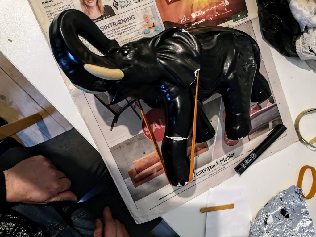 John kom med en næsten 1 kilo tung træelefant, der havde mistet den ene stødtand. John vidste jo, man selv skal have reservedele med, så han havde selvfølgelig medbragt en træklods i passende længe og størrelse, der forhåbentlig kunne ende med at blive til den mistede tand.En af vores dygtige frivillige kastede sig med stor entusiasme over projektet, følte sig endda kortvarigt som en tandlæge, da tandhullet skulle bores ud og renses.