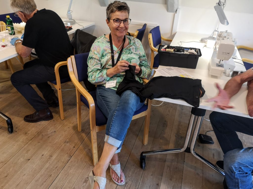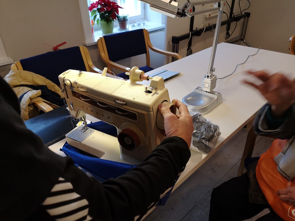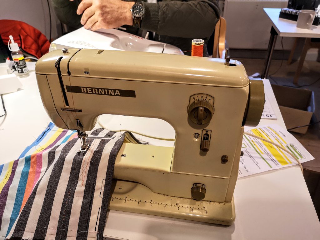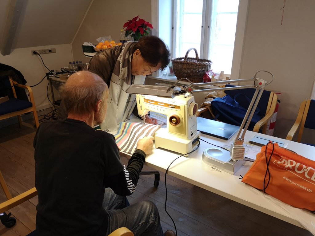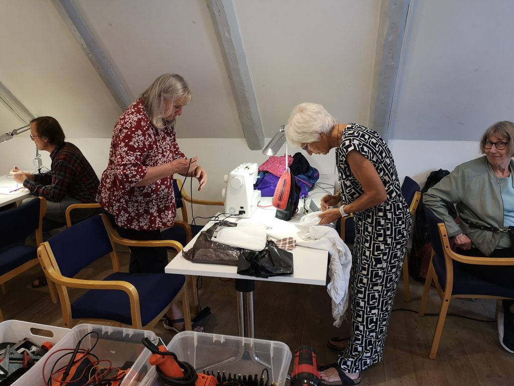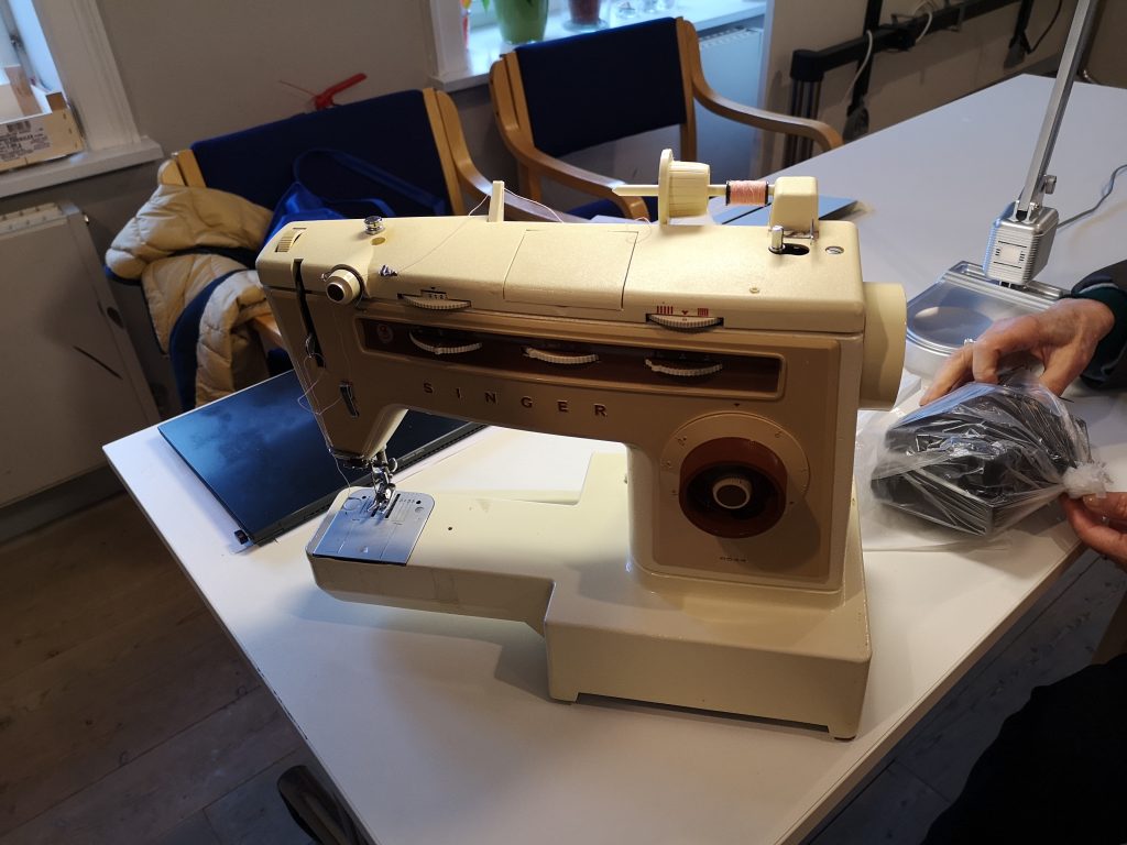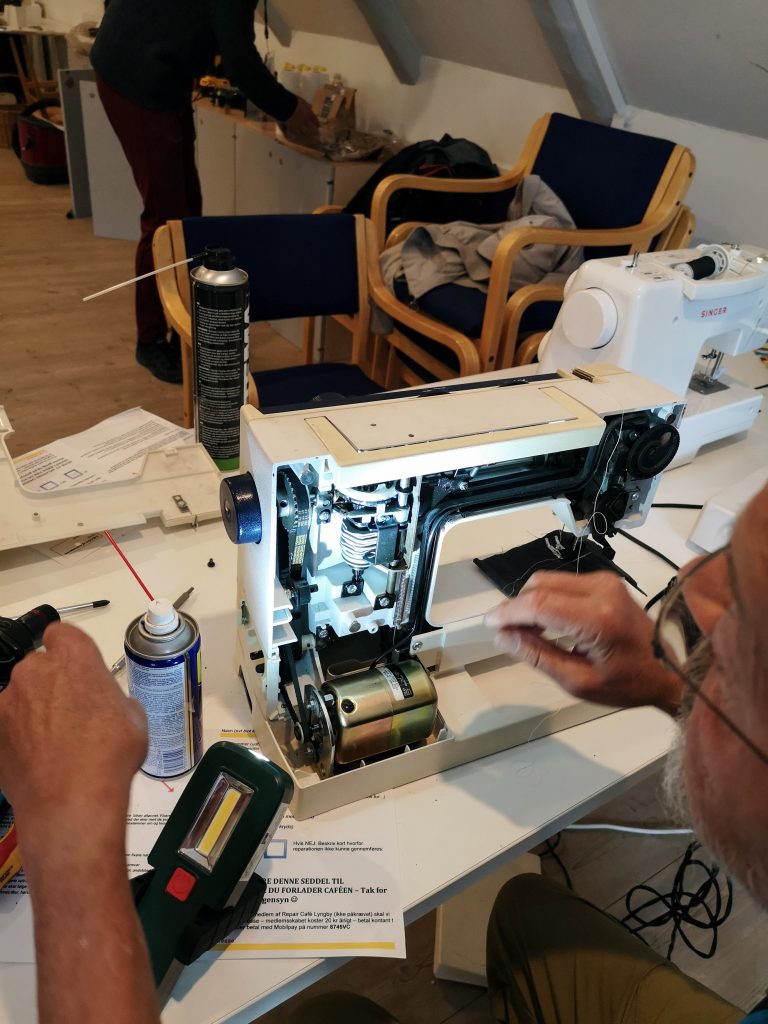 Den første reparation var en rigtig udfordring – Karin kom med en ældre symaskine, ren mekanik, hvor den ikke ville tage undertråden med op, når man syede. Vores mandlige fiksere fik sig en udfordring, de flokkedes om symaskinen, mens Karin forklarede, hvordan et sådan ting funger. Der blev diskuteret længe, kom nålen nu langt nok ned, var trådspændingen korrekt, mmm.