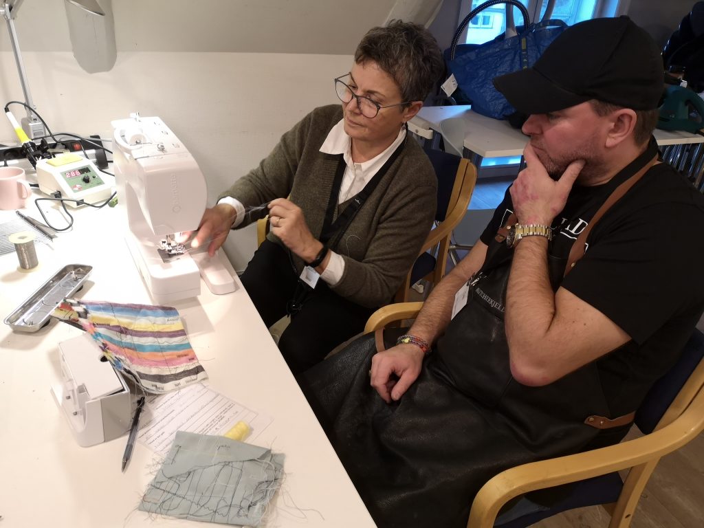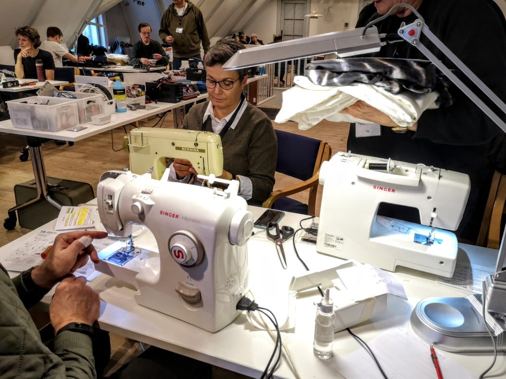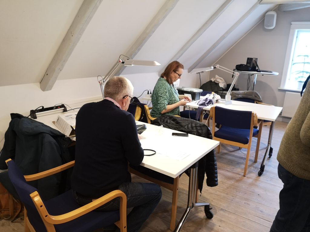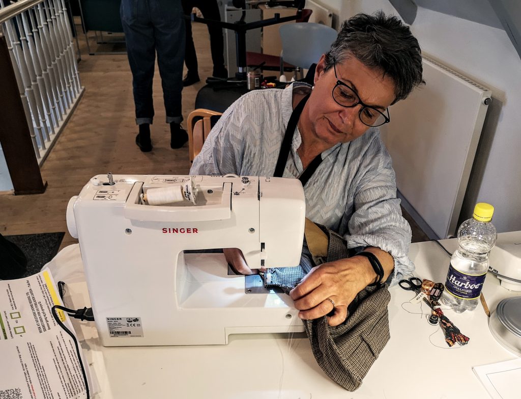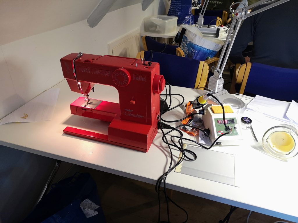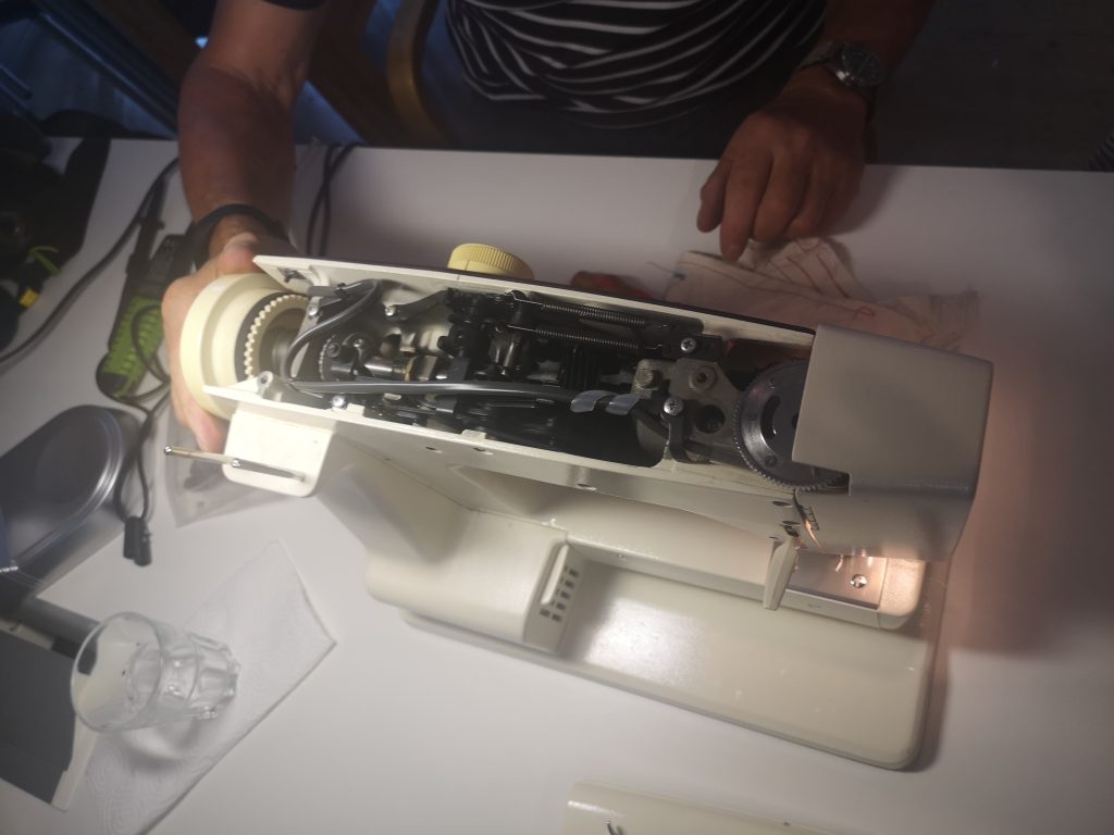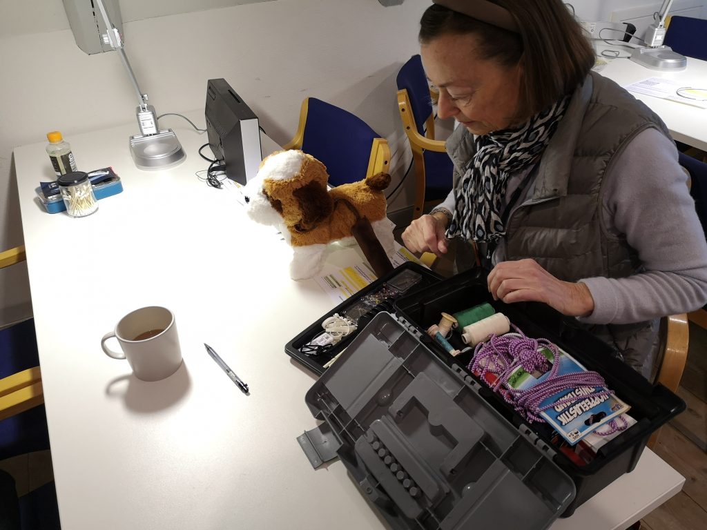 Den første reparation var en rigtig udfordring – Karin kom med en ældre symaskine, ren mekanik, hvor den ikke ville tage undertråden med op, når man syede. Vores mandlige fiksere fik sig en udfordring, de flokkedes om symaskinen, mens Karin forklarede, hvordan et sådan ting funger. Der blev diskuteret længe, kom nålen nu langt nok ned, var trådspændingen korrekt, mmm.