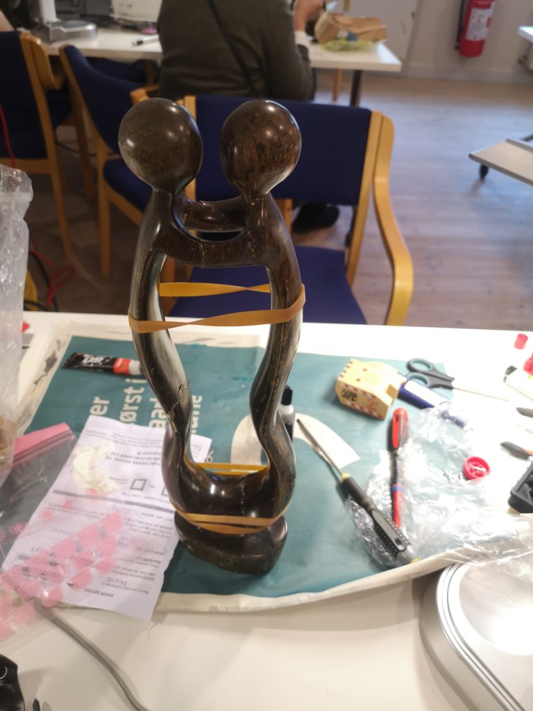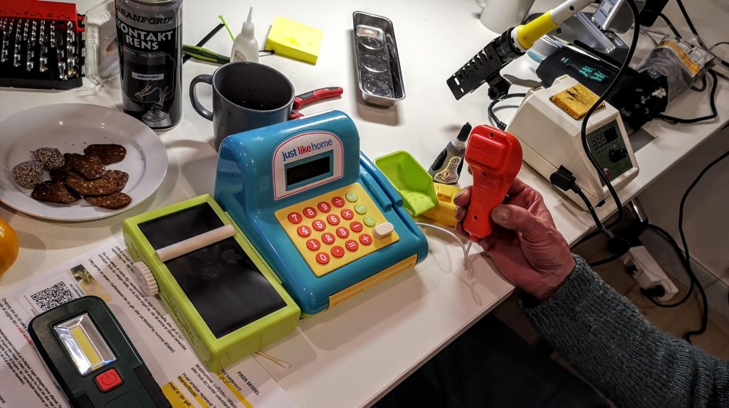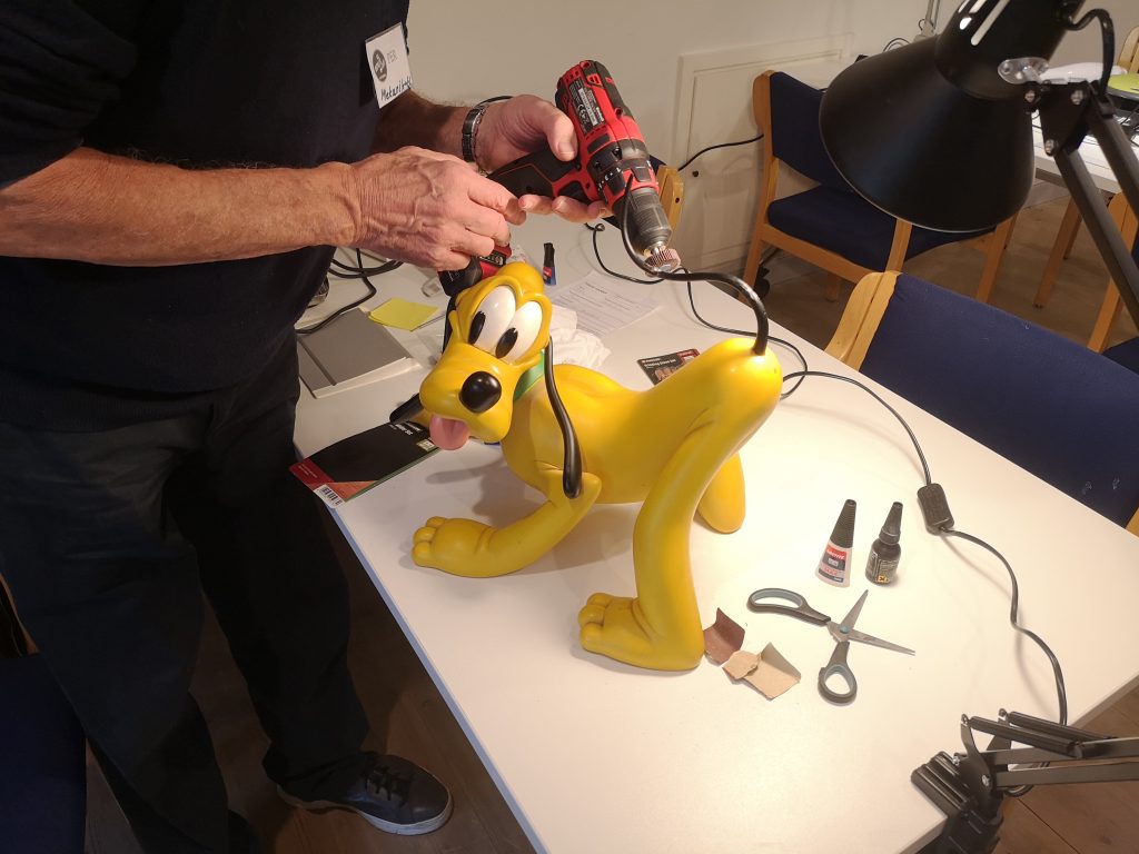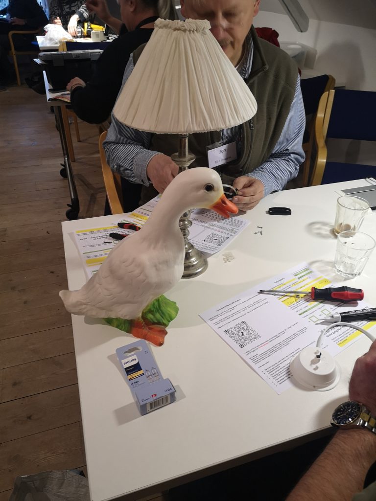 December måneds Repair Café blev afholdt i søndags, med lidt færre reparationer end i november. Vi fik indleveret 49 kilo materiale til reparation, men kunne desværre kun reparere de 24 kilo – eller i andre tal, så kom der 24 ting ind, hvoraf de 10 ting blev repareret. Blandt tingene var der den obligatoriske Bojesen abe (stor udgave), diverse lamper, en dias fremviser, hvor karrusellen ikke ville dreje rundt, samt en ret gammel dvd afspiller med skærm.Hvad vi blandt andet ikke kunne reparere var en dejkrog med “tandproblemer”.