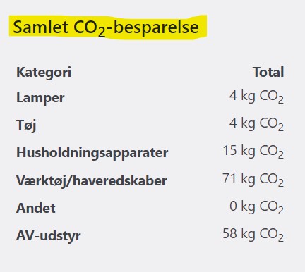 Det første billede viser, hvor mange kilo C02, vi gennem de sidste par år har sparet miljøet for.
