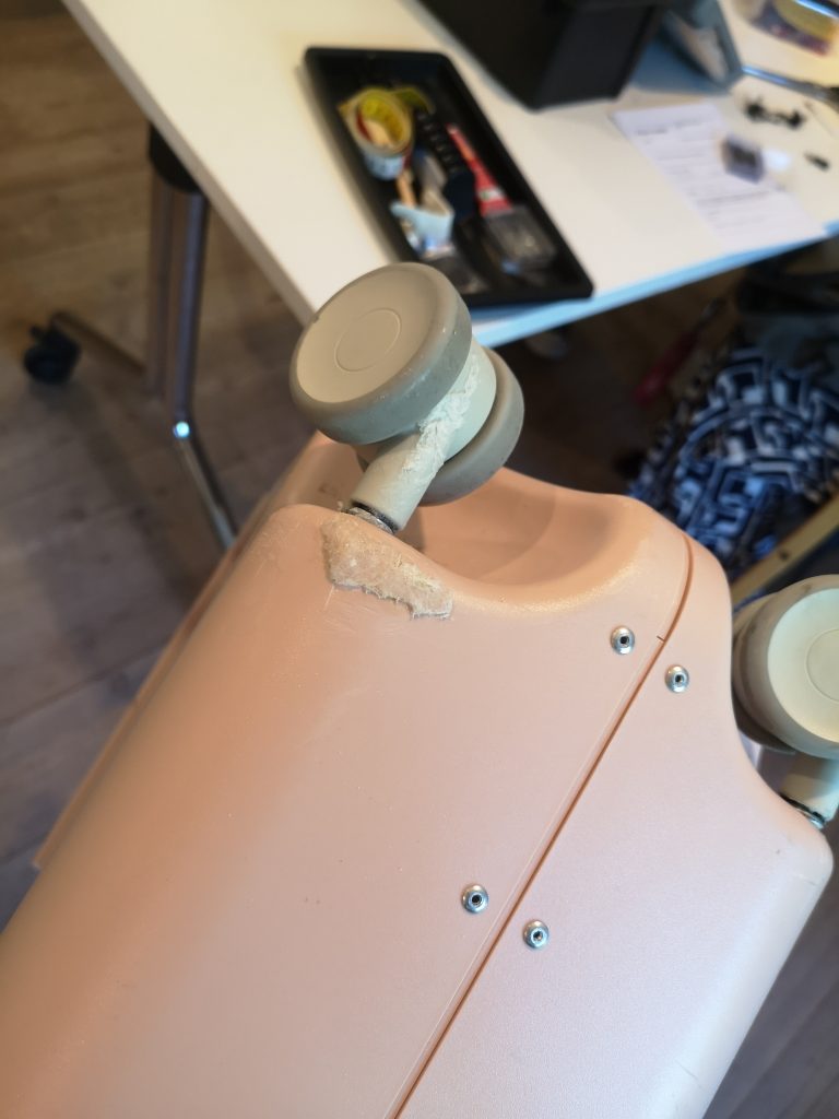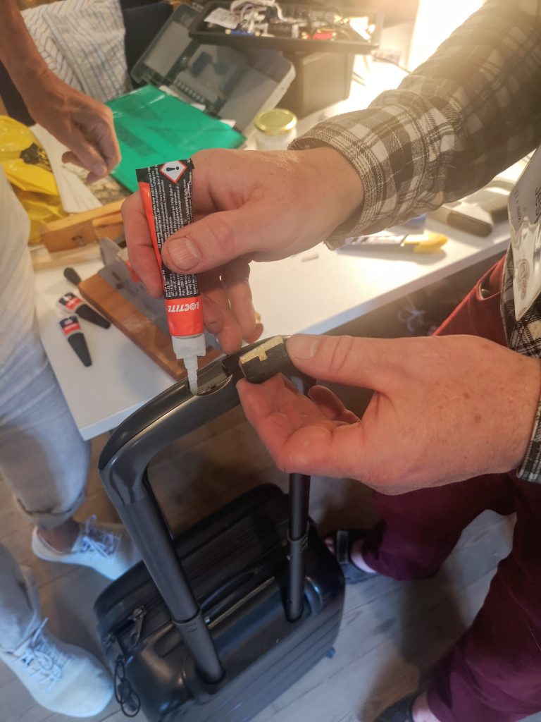 En kuffert havde tabt trykknappen til skydehåndtaget, men med en del snilde blev der konstrueret en ny knap af et stykke træ – håber reparationen holder!!